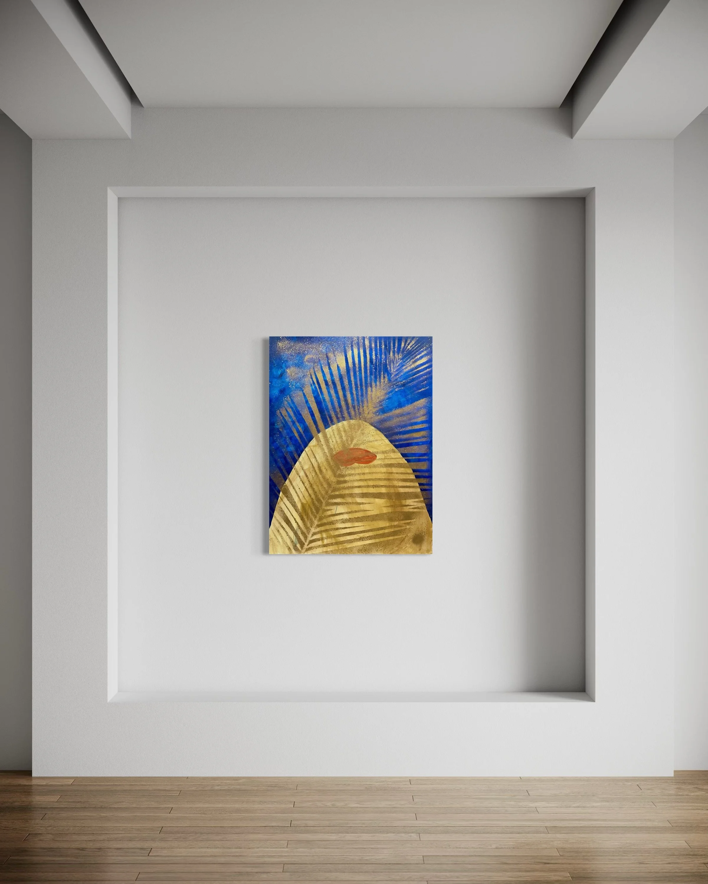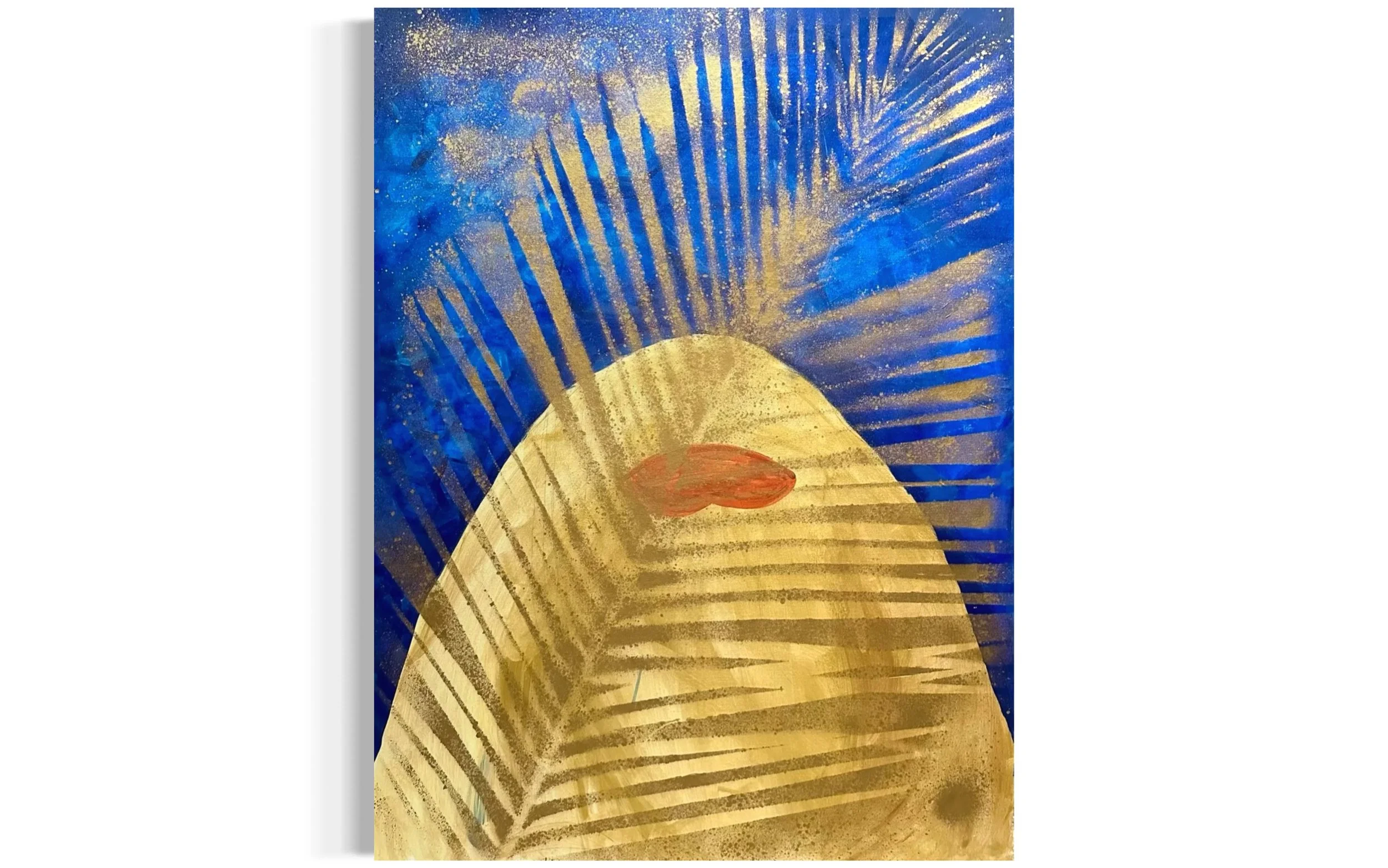 “GOLDEN SHADE” is a stunning abstract interpretation of a woman’s face delicately shaded by the silhouette of a palm tree. The golden leaves symbolize the warm, comforting embrace of sunlight filtering through the palm’s canopy, capturing that blissful moment of relaxation beneath its shade. Geena Marie’s use of gold tones against the softness of the face adds depth and warmth to the composition, evoking the peaceful yet radiant feeling of being kissed by the sun.
