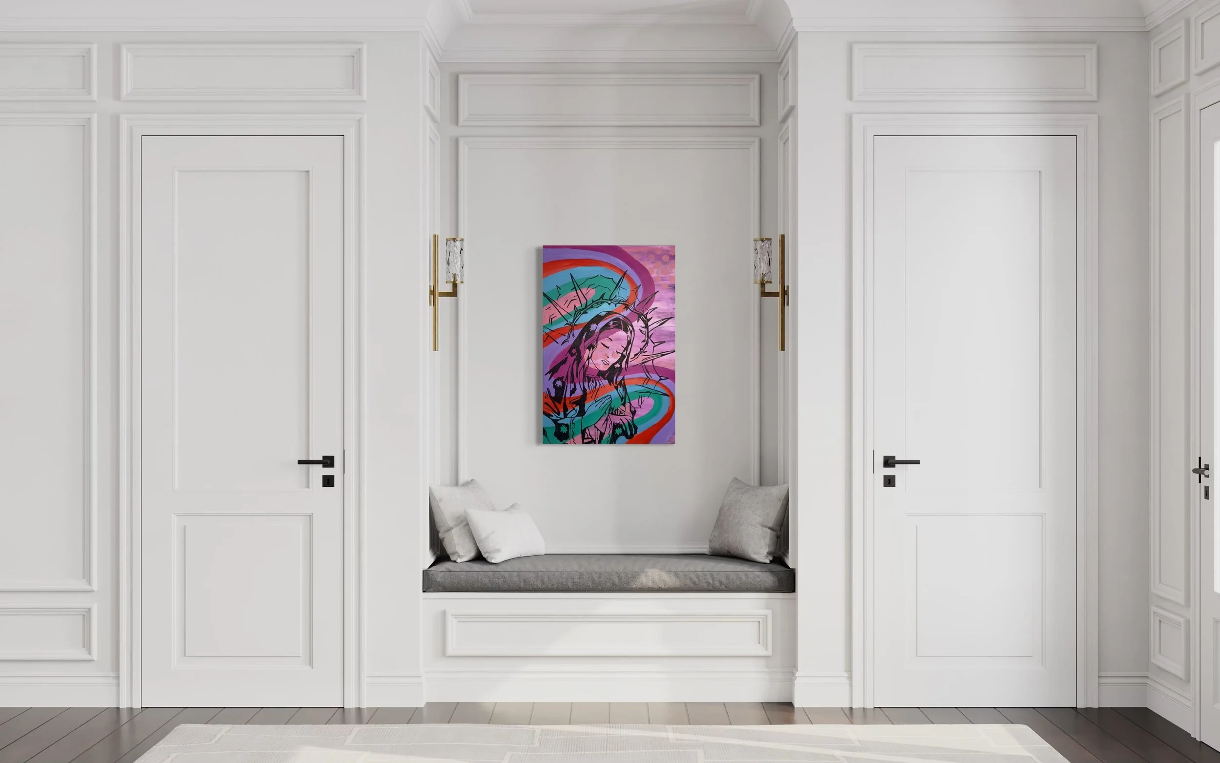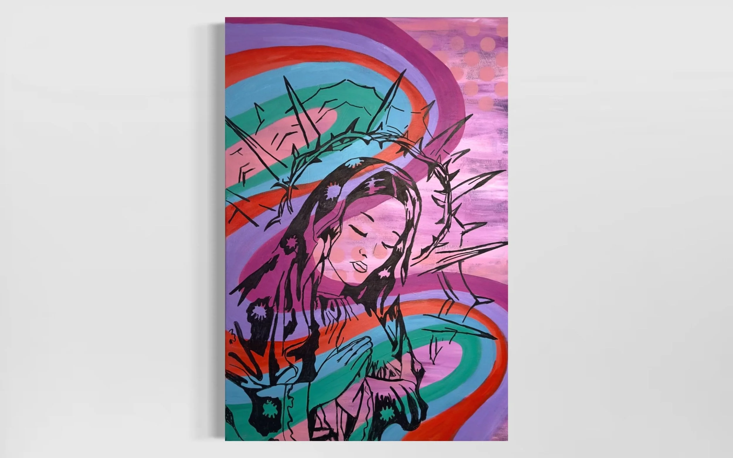“PRAYING FOR YOU” is a captivating fusion of color and emotion, featuring a veiled woman set against a vibrant, groovy background. The lively hues swirl in harmony, creating a sense of movement and energy, while the bold black outline frames the figure with striking contrast. This acrylic on canvas piece by Geena Marie conveys both mystery and serenity, as the veiled woman stands as a powerful symbol of quiet strength and prayer.